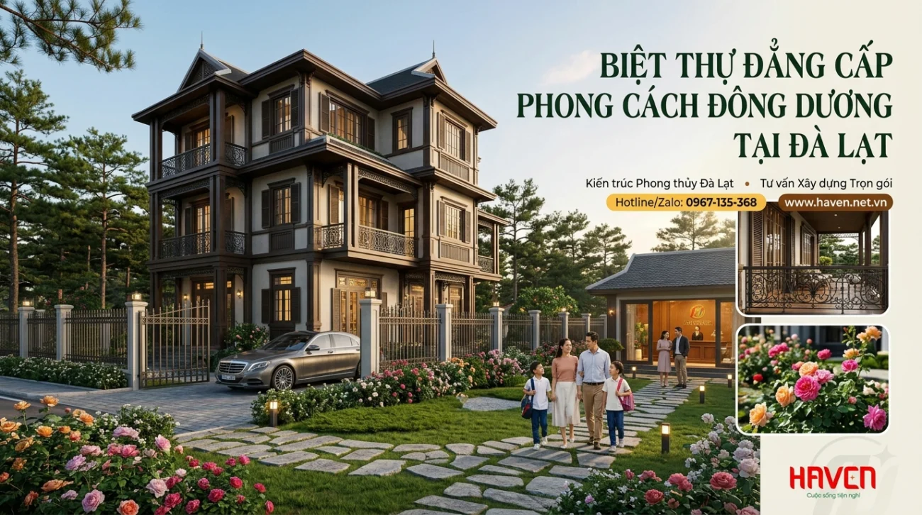Trong dòng chảy của kiến trúc di sản tại thành phố sương mù, phong cách Đông Dương (Indochine) luôn giữ một vị thế trang trọng bởi sự giao thoa hoàn hảo giữa nét lãng mạn Pháp và vẻ đẹp bản địa mộc mạc. Hình ảnh tòa biệt thự Đông Dương đẳng cấp với những hệ cửa lá sách đặc trưng và tông màu trầm ấm mà quý khách đang chiêm ngưỡng chính là tâm huyết của HAVEN trong việc hồi sinh những giá trị vượt thời gian tại Đà Lạt và Phường Lâm Viên. Tại HAVEN, chúng tôi mang đến giải pháp xây dựng nhà trọn gói tại Đà Lạt và Phường Lâm Viên không chỉ chú trọng đến tính thẩm mỹ mà còn đặt nền móng trên triết lý Kiến trúc Phong thủy chuẩn mực, giúp gia chủ kiến tạo một tổ ấm vượng khí, bền vững qua nhiều thế hệ.