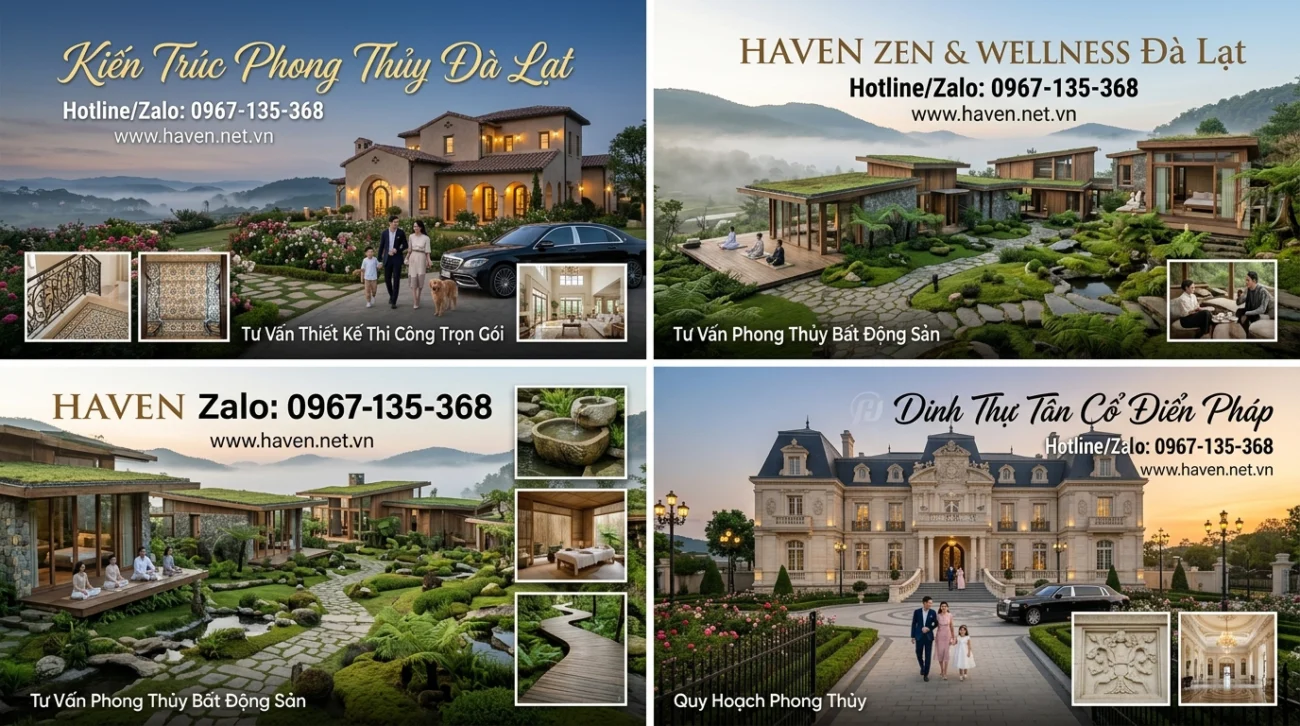 Trong tâm thức của những chủ nhân thượng lưu, một ngôi nhà tại Đà Lạt không chỉ là nơi lưu trú, mà là một “vùng đất an lành” để nuôi dưỡng tâm hồn và khẳng định vị thế di sản. Hình ảnh tòa dinh thự Tân cổ điển uy nghi, hòa quyện giữa ngàn thông và sương mờ mà quý khách đang chiêm ngưỡng chính là minh chứng cho sự kết hợp đỉnh cao giữa Thiết kế kiến trúc tại Đà Lạt và Phường Lâm Viên cùng triết lý phong thủy học sâu sắc. Tại HAVEN, chúng tôi không chỉ xây dựng những bức tường, chúng tôi kiến tạo không gian sống dựa trên sự minh triết của tổ tiên, giúp gia chủ đón trọn linh khí của đất trời cao nguyên. Nhu cầu xây dựng nhà trọn gói tại Đà Lạt và Phường Lâm Viên hiện nay đang dịch chuyển mạnh mẽ sang xu hướng “Kiến trúc xanh & Phong thủy trị liệu”, nơi mỗi công trình là một vật phẩm phong thủy khổng lồ bảo vệ gia đạo.